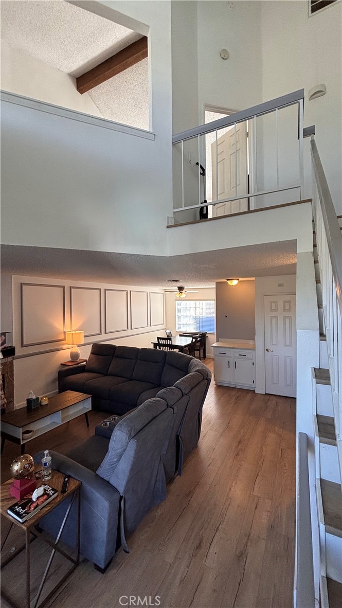 The home features a spacious loft-style bedroom with a walk-in closet and a private balcony overlooking the sparkling community pool and spa, which tenants may enjoy. The living room boasts high ceilings and flows seamlessly into the dining area and updated kitchen, complete with granite countertops, a large sink, and ample workspace—ideal for both everyday living and entertaining. Fully equipped with appliances.