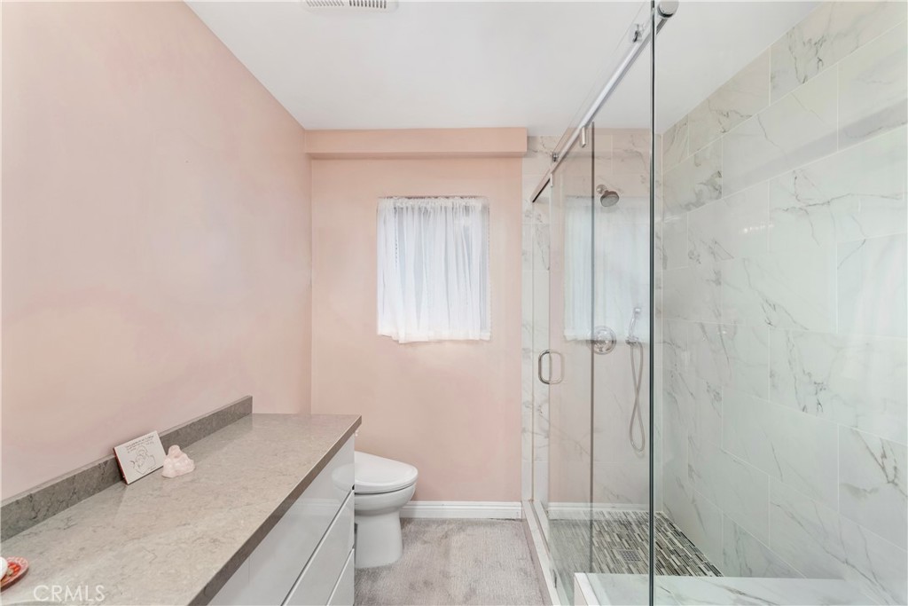 The modern kitchen includes frameless high-gloss cabinetry, quartz countertops, stainless steel appliances, a farmhouse sink, and under-cabinet LED lighting. The bathroom features a marble-tiled walk-in shower with built-in bench, quartz vanity, and a premium toilet.