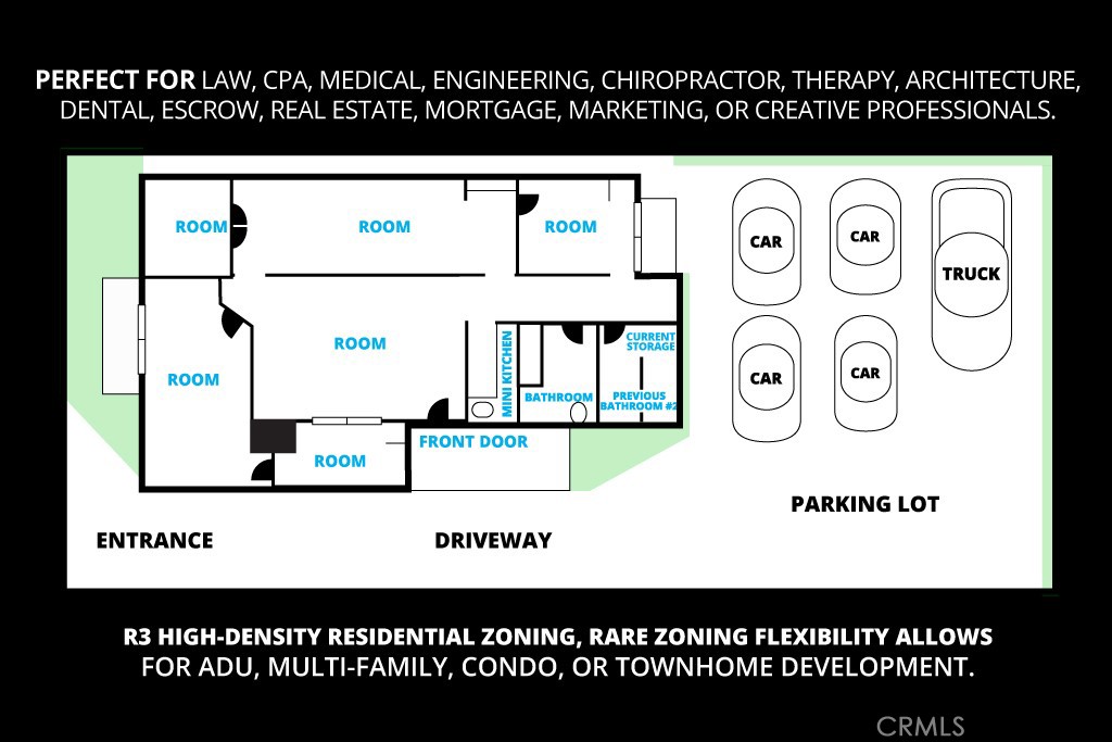 Currently configured as a permitted professional office space and zoned R3 High-Density Residential, allowing exceptional flexibility.