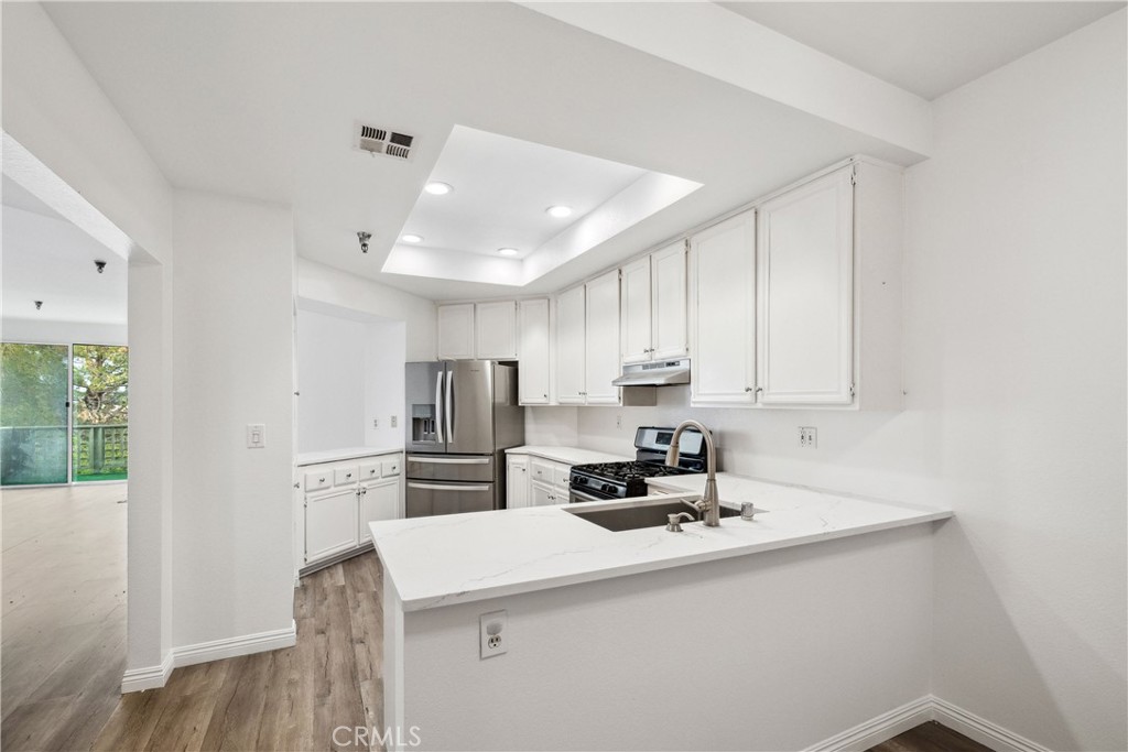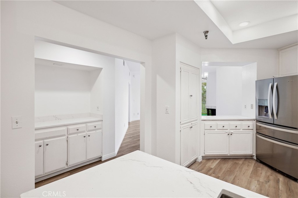 Step into a space that instantly feels like home. This beautifully upgraded, spacious single-story condo offers a bright, thoughtfully designed living space filled with natural light and timeless comfort. Live the simple life with functionality and ease. When you enter, you are welcomed into an inviting living room anchored by a cozy gas fireplace, perfect for relaxing or entertaining. The kitchen features sleek quartz countertops, abundant cabinetry, and generous prep space. It flows seamlessly into a spacious dining area for casual meals and special gatherings. Elegant lighting, freshly painted walls, and newer flooring enhance the ambiance and add a touch of modern sophistication. While tax records reflect the home as having 2 bedrooms, a versatile enclosed bonus room used as a third bedroom adds flexibility for a home office or creative retreat. Whether you need a quiet workplace, a cozy reading nook this space adapts to your needs. Step out onto your private balcony and unwind in the stunning sunset views of the mountains, sparkling city lights, peek-a-boo harbor, and even fireworks on special nights. It is a peaceful outdoor escape that brings nature and serenity to your doorstep. The primary suite offers a retreat with ample space, double closets, and an en-suite bathroom with dual sinks, a soaking tub, a separate shower, and a large vanity. The updated hall bathroom features a modern vanity and finishes that offer style and everyday function. Additional highlights include AC, in-unit laundry, hallway storage, and a convenient wet bar, ideal for entertaining or keeping your favorite beverages on hand. Located in a secure, gated community at the end of a peaceful cul-de-sac, residents enjoy fun amenities including a sparkling pool, spa, gym, barbecue area, and a recreational room with a billiard table. Lush landscaping and walking paths create a resort-style environment where neighbors can gather, relax, and feel at home. Two side-by-side parking spaces in a gated garage with EV chargers, no steps from parking to the unit, a personal storage closet, and plenty of guest parking provide added convenience and security. This ideal location is just minutes from shopping, dining, parks, top-rated schools, and freeway access. Whether looking for quiet comfort or vibrant community living, The Terraces offer a unique blend of comfort and community in a home rarely available in this desirable neighborhood. Do not miss out!