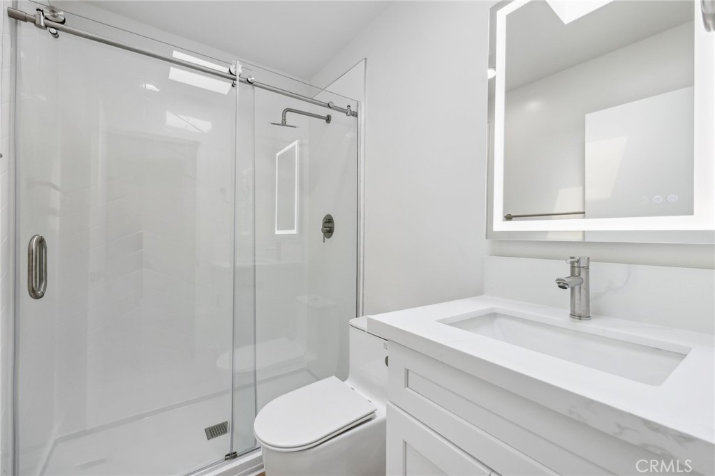 The well-appointed kitchen is a culinary enthusiast's dream, featuring modern stainless steel appliances, including a refrigerator, stove and oven, microwave, dishwasher, and disposal. The combination of tile and vinyl flooring adds a stylish yet practical touch, making maintenance a breeze. Thoughtful mirrors throughout the unit enhance the bright and open atmosphere.