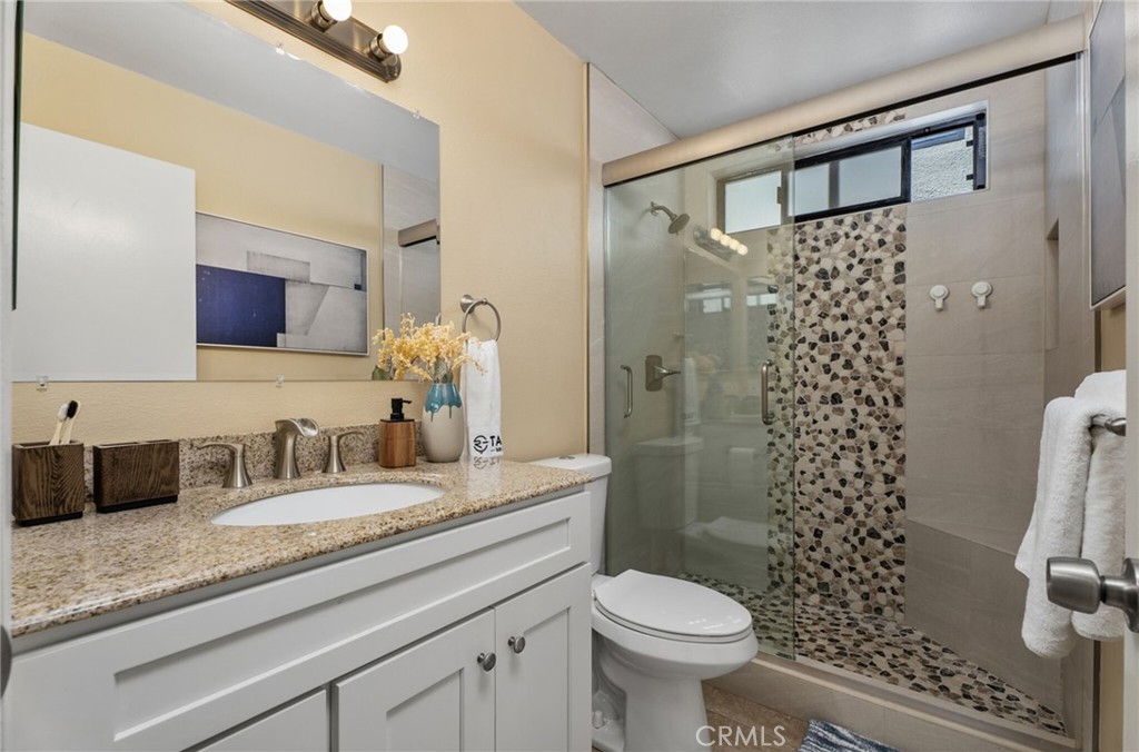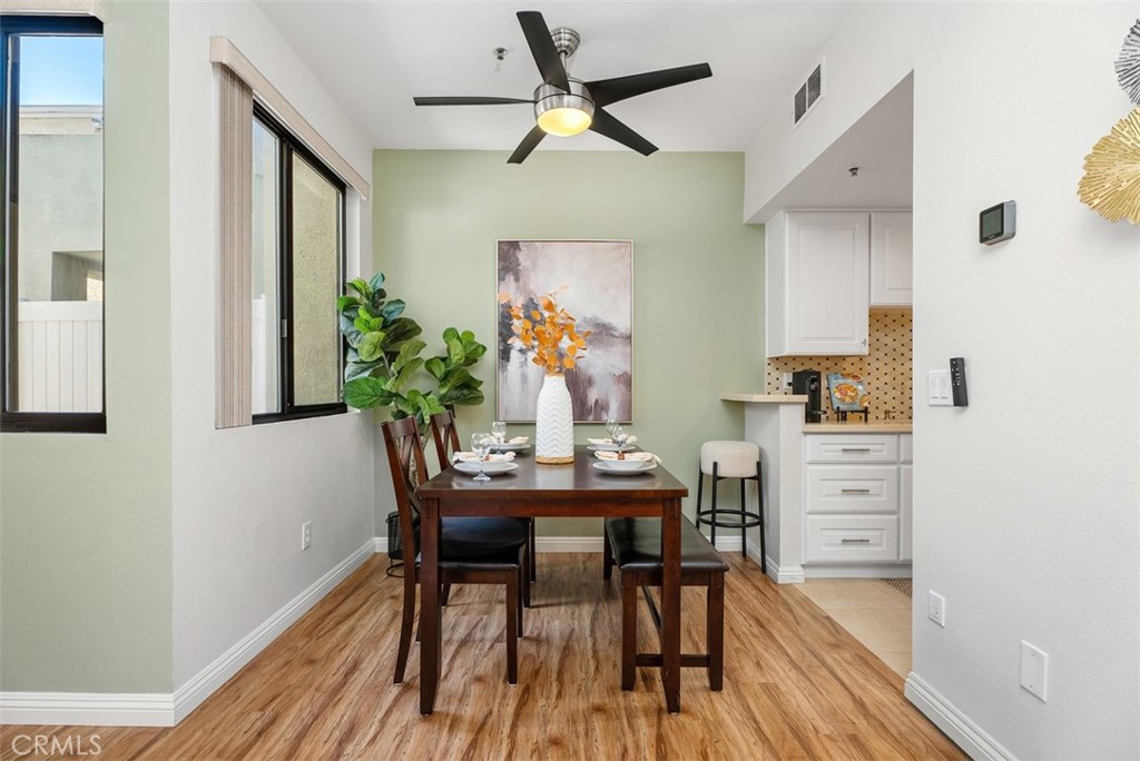 Welcome to this beautifully updated 2 Bedroom 2 Bathroom single level condo. Featuring 2 Master Suites, each with its own full bathroom and walk-in closet. One bathroom includes a tub with shower, while the other has a walk-in shower for added versatility. Enjoy the open living space with high ceilings, a fireplace in the living room, and laminate wood-like flooring that brings warmth throughout. The upgraded kitchen offers plenty of storage, modern finishes, and is paired with the convenience of an in-unit stackable washer and dryer located in the kitchen closet. Parking is convenient with a 1-car detached garage, an additional assigned space, plus ample guest parking. This home is move-in ready and offers the perfect blend of style and function in a desirable location, near the beach, trendy restaurants, and local grocery stores, you’ll have everything you need just minutes away.