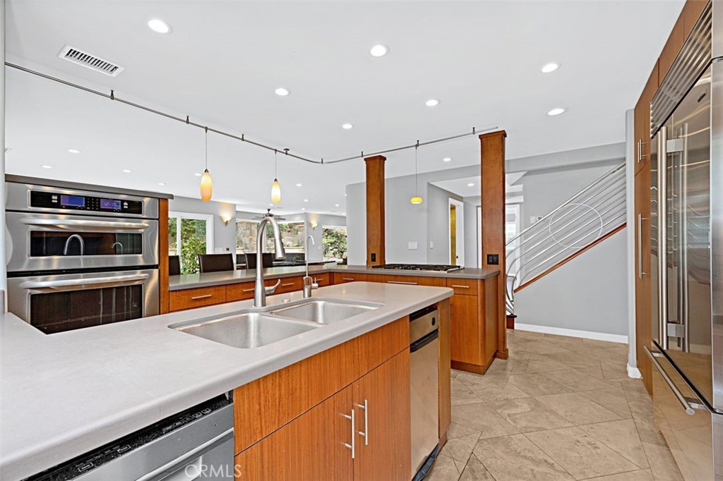 European Style set in a sought-after neighborhood within the West High School district, this large three-bedroom residence combines impressive scale with refined comfort. The home’s centerpiece is a high-end, European-style kitchen—beautifully remodeled with premium finishes and appliances—that flows into an expansive family room anchored by a sunken bar, Sub-Zero refrigerator, and wine cooler. Perfect for entertaining, the entire living area opens to a lush tropical patio retreat complete with a cascading waterfall and pond, built-in fireplace, and barbecue.