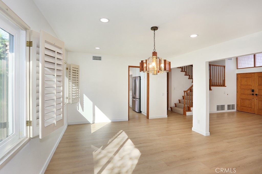 The ground floor features durable vinyl flooring throughout the 1st floor, combining modern style with easy maintenance. A spacious living room seamlessly connects to the dining area, creating the feel of an open floor plan perfect for entertaining, family gatherings, or everyday comfort. High ceilings and abundant natural light enhance the sense of openness, while fresh paint and brand-new carpet upstairs make the home move-in ready.