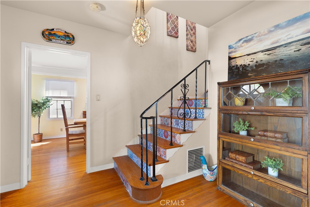 CLASSIC HOME AND AN UNOBSTRUCTABLE VIEW AT WHAT PRICE??? Perched high above the street, this timeless 1937 Spanish-style home captures sweeping views of the Los Angeles Harbor and the iconic Vincent Thomas Bridge. Arched windows and classic architectural details set the tone, while original hardwood floors add warmth and character throughout. The spacious living room features coved ceilings, and a striking wood burning fireplace with an oak mantle and stone facing as its centerpiece. Many windows bathe the space in bountiful sunlight and harbor views can be seem from almost every room in the house! With over 1,700 square feet, the floor plan is both generous and functional. The large formal dining room flows into a beautifully remodeled kitchen, appointed with hickory cabinets, granite countertops, stainless steel appliances (including a French door refrigerator), and a convenient wet bar/prep sink. A built-in office nook and a garden window overlooking the lush backyard add both style and utility, while the adjacent laundry room provides even more storage and pantry space. An updated ¾ bath completes the first level. As you make your way up the winding staircase with its original iron railing, you’ll find two spacious bedrooms – one with dual closets, including a walk-in! There is also an updated full bathroom. A versatile bonus room (perfect for a nursery, office or creative space) opens to a shaded veranda overlooking the backyard. The backyard is a true retreat—boasting a mature avocado tree heavy with fruit, a wide grassy area, a large entertaining deck, and a Tuff Shed for extra storage. Alley access to a two-car garage completes the property. Over time, this property has been updated with dual pane windows, newer FAU, water heater (2021), and even drain and sewer line upgrades. There is added storage in the (easily accessible) basement…or maybe even a potential wine cellar! Surrounding new construction can only increase your home's value! This property is well located close to everything you need, and not far to the Marina, Cabrillo Beach, AltaSea, Cabrillo Marine Aquarium, Crafted and so much more! The main attraction is the upcoming West Harbor waterfront, with new restaurants, shops, an amphitheater and even a Ferris Wheel! This home blends historic charm with thoughtful updates, all in a hillside setting with amazing harbor views. ***THIS PROPERTY QUALIFIES FOR A $20,000 COMMUNITY GRANT PROGRAM THROUGH CITIBANK'S LADDER-UP PROGRAM***