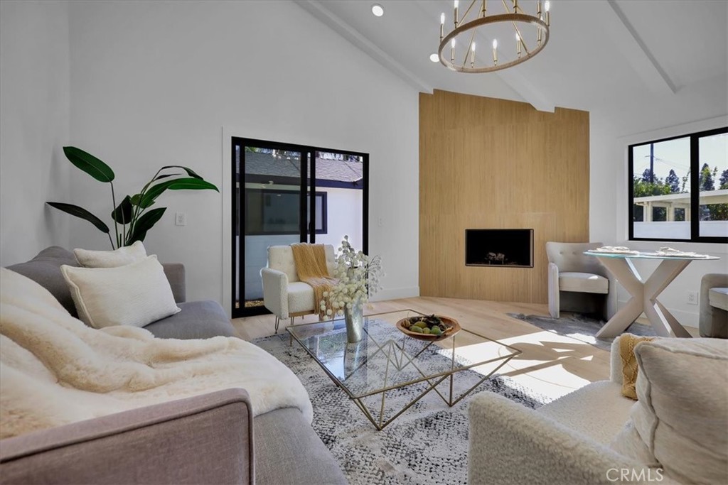 A pass-through window from the kitchen overlooks the family room with higher ceilings, a fireplace, a modern chandelier, and sliding glass doors leading to the backyard. The outdoor space has been newly landscaped and includes concrete stepping stones to a covered seating area with lattice detailing. An additional flex room off the garage provides versatile use and offers direct access to the backyard and garage.