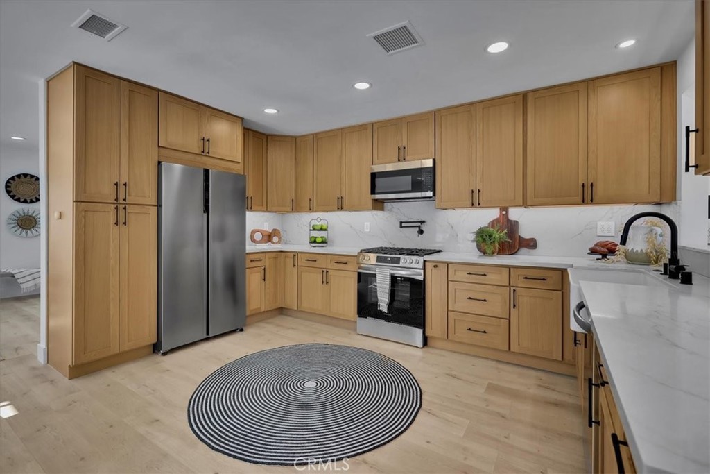 Inside, the home showcases new flooring, fresh interior paint, new windows, and recessed lighting. Upon entry, the home opens to a formal living room that flows seamlessly into a formal dining area, both enhanced by large windows for natural light. The dining space connects directly to the spacious kitchen, which features brand-new appliances, abundant cabinetry, light countertops, and a matching backsplash. A laundry area is located adjacent to the kitchen.