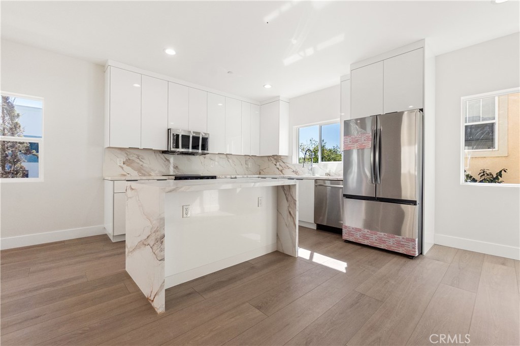 Step into a bright, open-concept floor plan featuring expansive windows, elegant flooring, and a chef-inspired kitchen with quartz countertops, premium stainless-steel appliances, sleek cabinetry, and a spacious island — perfect for entertaining friends.