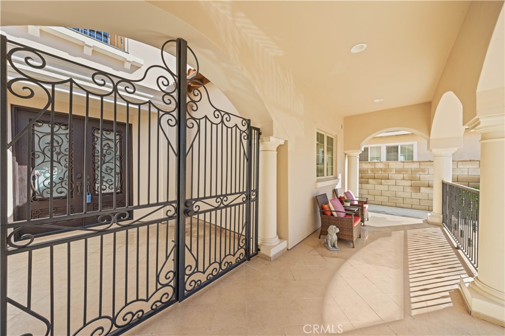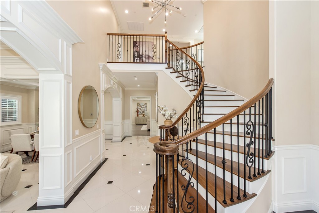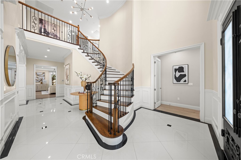 Step through the impressive double doors into a grand foyer with soaring 20-foot ceilings, where natural light cascades across the space in a stunning display of scale and sophistication. Intricate ceiling moldings, expansive door frames, and custom wall paneling throughout the home highlight exceptional craftsmanship and timeless design. To the left, a bright formal living room opens to the front courtyard lounge; to the right, a gracefully curved staircase with ornate railings captures both grandeur and artistry.
