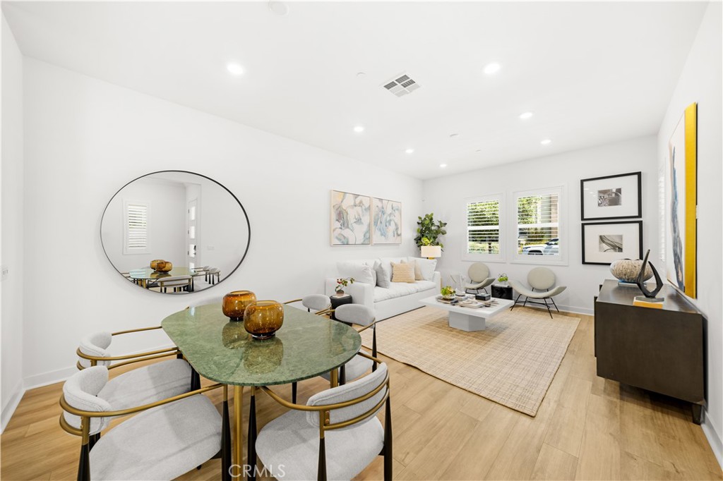 The first level features a spacious open-concept floor plan where the living and dining areas flow seamlessly together—ideal for both everyday living and entertaining. Sliding glass doors lead to a covered patio, creating a smooth transition for indoor-outdoor enjoyment.