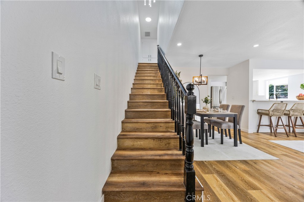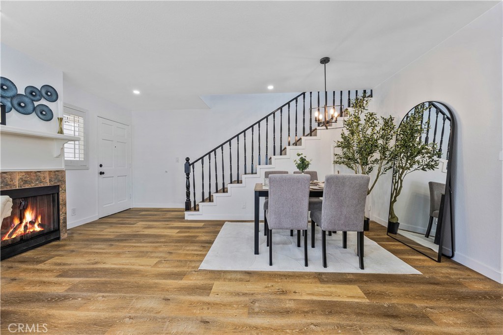 designed living space, this home features a spacious layout with wood laminate and tile flooring on the main level. The inviting living room opens to a private patio