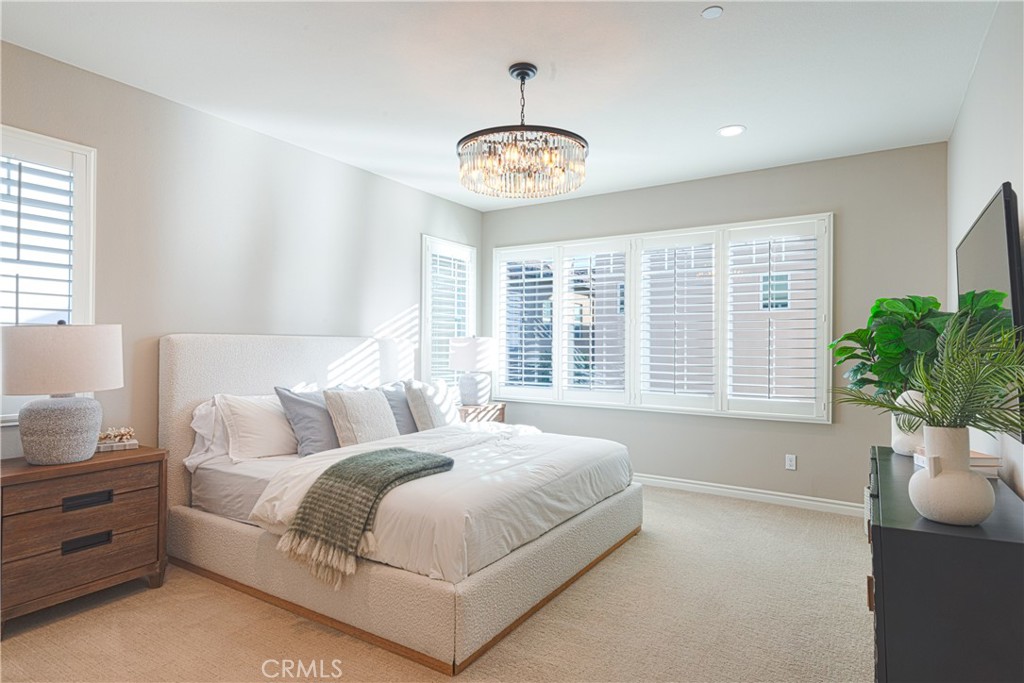 The primary suite offers a serene atmosphere with a soft, neutral palette, elegant chandelier, and an abundance of natural light. The ensuite bath features dual vanities, a deep soaking tub, a newly installed glass shower enclosure, and a large walk-in closet. Two secondary bedrooms enjoy beautiful light and generous closet space, complemented by a shared full bath with dual sinks and a convenient upstairs laundry room with extra storage.