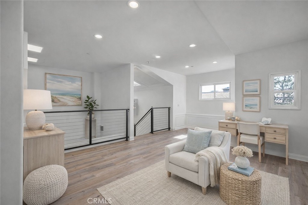 The expansive loft is a standout feature, offering endless possibilities as a media room, home office, or additional entertaining space. With modern architectural angles, skylights, cable-style railing, plank-style flooring, and direct access to an oversized balcony, it feels like a private retreat.