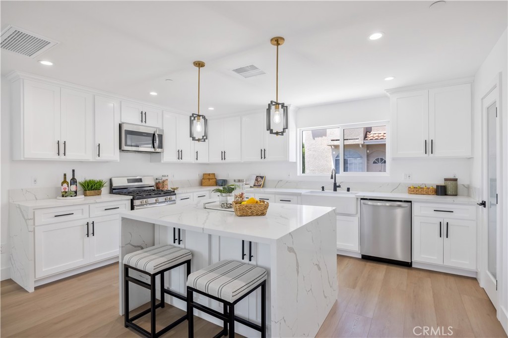 The chef-inspired kitchen boasts a large quartz island, stainless steel appliance package, farmhouse sink, and walk-in pantry—perfect for hosting gatherings. The living room opens to a private balcony, while the ground-level patio offers additional outdoor space. The luxurious primary suite includes a spa-like bathroom with a walk-in shower, soaking tub, dual vanities with quartz counters, and a generous walk-in closet.