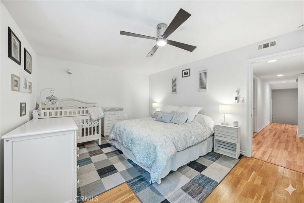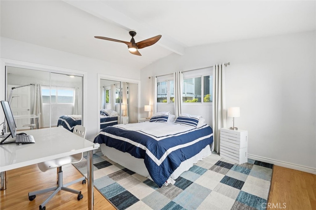 Downstairs, two large bedrooms offer space and flexibility for family, guests, work, or creative pursuits. One of them opens through sliding doors to the backyard—a serene extension of the home perfect for lounging, play, pets, or simply enjoying the South Bay breeze. Hardwood floors, recessed lighting, air conditioning, and thoughtful updates throughout elevate comfort without overwhelming the simplicity of the design. The oversized two-car garage with a full window provides options for a gym, office, or studio as life evolves.