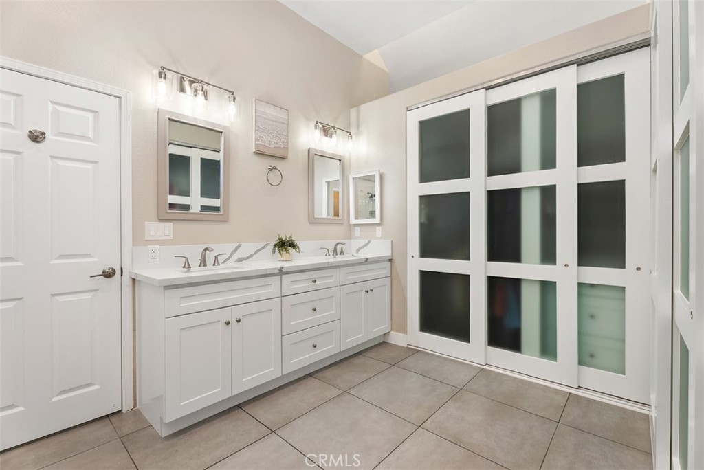 Upstairs, the primary suite features a spa-inspired bathroom with a double-sink vanity, deep soaking tub, and elegant finishes. Two additional bedrooms share a full bathroom, with one currently used as an office.