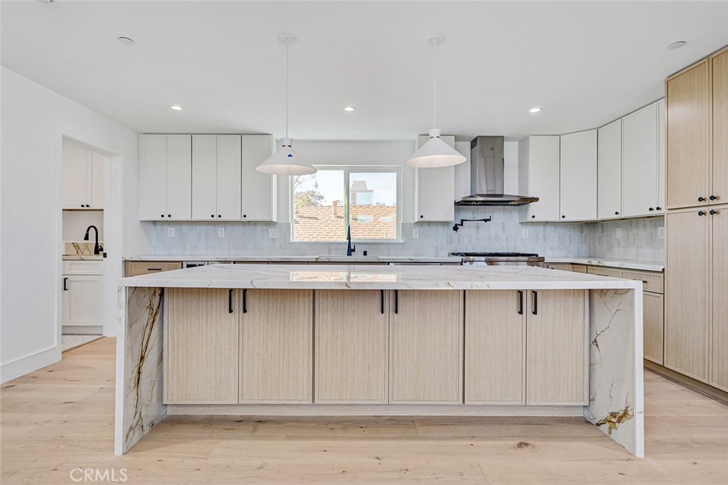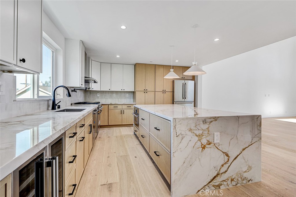 The home features an open and bright floor plan, anchored by a stunning chef’s kitchen, equipped with premium Thermador appliances, custom-designed cabinetry, and a dramatic waterfall-edge island that serves as both a functional workspace and an elegant focal point for gathering. Engineered hardwood floors flow throughout the home, enhancing the sharp and clean aesthetic. The second floor living area is highlighted by soaring 18-foot ceilings, creating a bright and airy atmosphere that elevates everyday living.