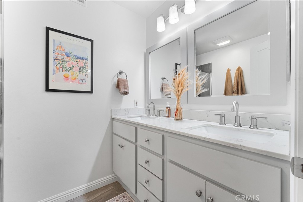 Tucked in a premium Inside the Loop location, this one-level lower unit offers an inviting blend of comfort, thoughtful updates, and everyday livability. The kitchen feels both fresh and timeless, with gray shaker cabinetry, granite counters, and stainless steel appliances opening effortlessly to the dining area—designer pendant lighting and detailed wall moulding add a touch of character and warmth from the moment you step in. The main living space brings in natural light and greenery through sliding doors that lead to the patio, creating an easy indoor-outdoor flow for dining, morning coffee, or simply relaxing at the end of the day. The serene bedroom layout includes a calm primary retreat with designer wall detailing, a ceiling fan, and its own sliding doors for added fresh air and light. The secondary bedroom offers great storage and flexible use options, whether for sleeping, working, or creative space. Both bathrooms have been updated with a clean, refined aesthetic—modern vanities, fixtures, and timeless finishes that feel cohesive throughout. Enjoy the convenience of inside laundry, nearby walking trails, and close proximity to the amenities Woodbridge is known for: lakes, tennis and pickleball courts, pools, and recreation spaces managed by the highly-regarded HOA. A lifestyle rooted in comfort, connection, and the ease of being Inside the Loop.