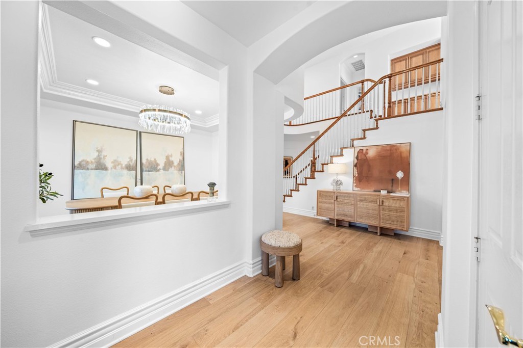 Stunning Residence in the exclusive 24-hour guard-gated Northpark community! Situated on a premier corner lot, this remarkable home offers 5 bedrooms plus a loft, a main-floor bedroom with a full bathroom, a 3-car garage, an upgraded kitchen and backyard—all on a lot over 6,200 square feet. Upon entry, you are greeted by a warm, open floor plan with high ceilings, hardwood floors extending throughout, and an abundance of natural light. The spacious chef’s kitchen is filled with light and includes maple cabinets, stone backsplash, granite countertops, a built-in refrigerator, a 6-burner cooktop, double ovens, and a large oversized island. It opens directly to the beautiful family room, complete with built-in media cabinets, a cozy fireplace, and seamless access to your private backyard retreat. Step outside to your expansive backyard, professionally landscaped with a serene waterfall, an elegant gazebo, and lush fruit trees and flowers—perfect for both relaxation and hosting. The main-floor bedroom and full bath provide ideal accommodations for family or guests. Upstairs, you will find four additional bedrooms and a generous loft (easily convertible to a sixth bedroom). The well-appointed primary suite features a spa-like bathroom with dual vanities, a soaking tub, a separate shower, and a large walk-in closet. It also includes a separate retreat area, perfect as a sitting room or home office. At the other end of the floor, two more spacious bedrooms share a Jack-and-Jill bathroom, while another bedroom enjoys an en-suite bathroom. Practical upgrades include an upstairs laundry room and a 3-car garage with plentiful storage. With low HOA and Mello Roos fees, residents enjoy access to community amenities such as five pools, tennis courts, walking trails, and direct access to the acclaimed Hicks Canyon Elementary School. The home is also conveniently within walking distance of Orchard Hills and Northpark Shopping Centers, featuring Pavilions, Wells Fargo, H Mart, CVS, and numerous dining options. The property is zoned for California Distinguished Tustin Unified Schools. Priced attractively, this home presents a rare opportunity in today’s market. Must See.