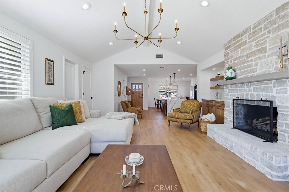 This single-level home located on a beautiful tree lined street offers a fully remodeled kitchen featuring a large waterfall island with quartz countertops, handmade Zellige tile backsplash, porcelain farmhouse kitchen sink, gas stove, dishwasher, and drawer microwave and LG electric ductless stackable washer and dryer are also included. The home showcases SPC flooring, newer interior shaker doors, and baseboards and casing throughout. The large living room has a vaulted ceiling Grand candelabra light fixture along with a striking "Fond du Lac" natural stone fireplace all installed in 2023. The primary bedroom suite is spacious and includes a walk-in closet and a large, remodeled bathroom and new sliding glass doors that lead out to the private backyard.