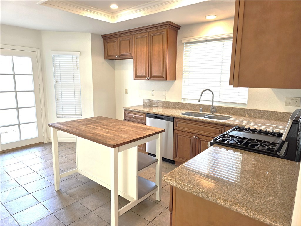 The kitchen includes upgraded cabinets, granite countertops, an island, and French doors that open to a nicely sized backyard and side yard. The yard provides convenient access to the garage.