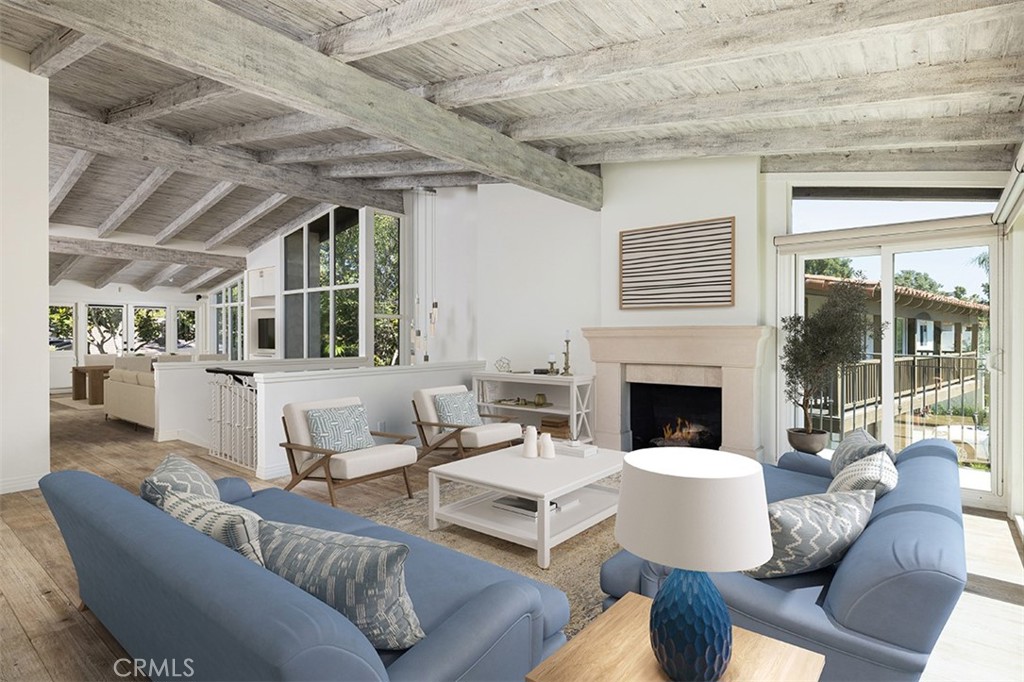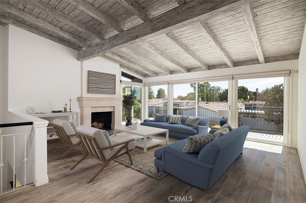 A large light-filled staircase with pendant lighting leads to the expansive upper level, detailed with rustic reclaimed wood beam ceilings, light wide plank hardwood floors, and ]lots of natural light create an wonderful living space. The large main living areas include a family room with a stone-framed fireplace, dining area and large sliding glass doors that open to a private wraparound balcony with access to beautiful green belt. End unit allows a ton of light and added privacy with only one shared wall.