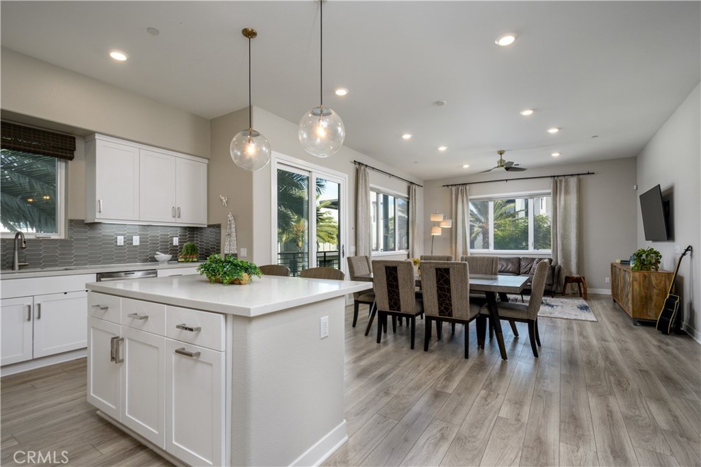 The main living area presents an open-concept great room with sophisticated designer touches, seamlessly connecting to the gourmet kitchen. Here, sleek solid-surface countertops, a spacious center island, custom backsplash accents, and stainless-steel appliances create a perfect environment for daily living and entertaining. Multiple patios—including one off the main level—extend the living space outdoors, offering the perfect spot for morning coffee or evening relaxation.