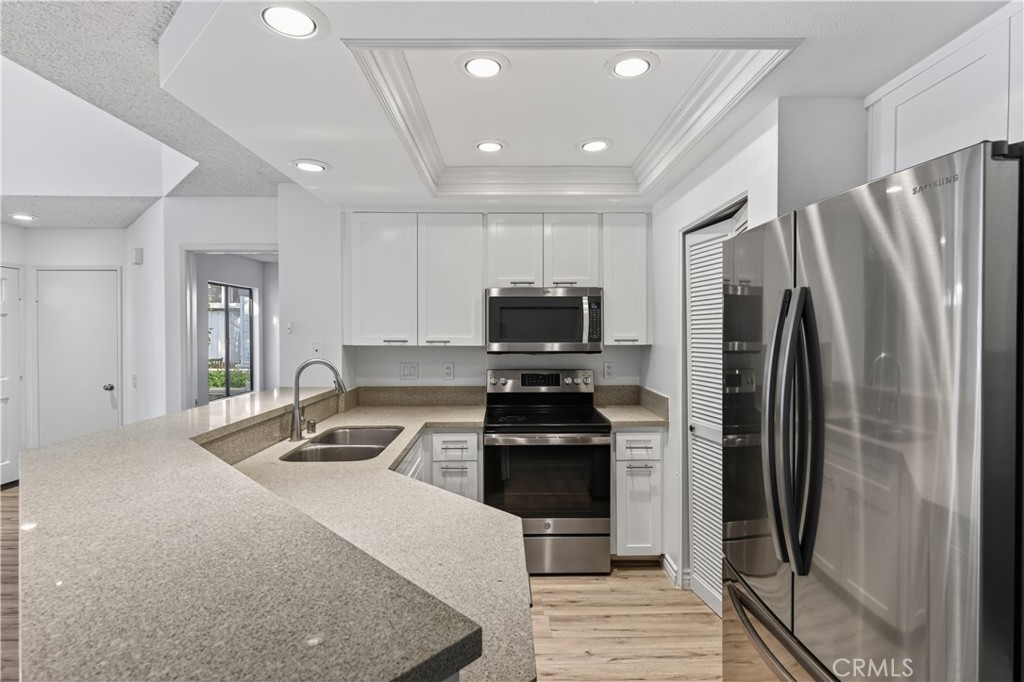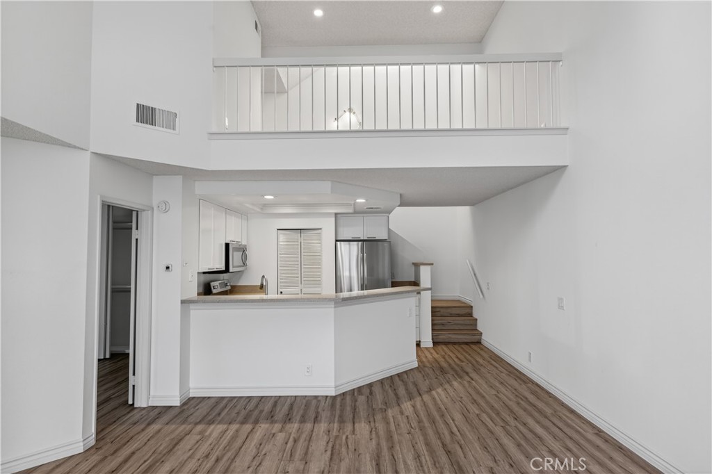Welcome to this beautifully upgraded end-unit townhome in the highly desirable Woodbridge community of Irvine! Offering 2 bedrooms, 2 bathrooms, and an open 1,171 sq ft floor plan, this light and bright home features vaulted ceilings, skylights, and abundant natural light throughout. The modern kitchen is fully updated with quartz countertops, stainless steel appliances, and custom cabinets that open to a spacious dining and living area with a cozy fireplace. One bedroom and a full bath are conveniently located on the main level, while the primary suite upstairs includes an en-suite bath and a large closet. A versatile loft area provides the perfect space for a home office or reading nook. Additional highlights include laminate flooring (no carpet), recessed lighting, plantation shutters, inside laundry, and a private patio ideal for relaxing or entertaining. The home also includes a detached one-car garage plus additional guest parking nearby. Enjoy resort-style living with access to Woodbridge’s incredible amenities—two scenic lakes, beach lagoons, multiple pools and spas, tennis and pickleball courts, parks, playgrounds, and walking trails.