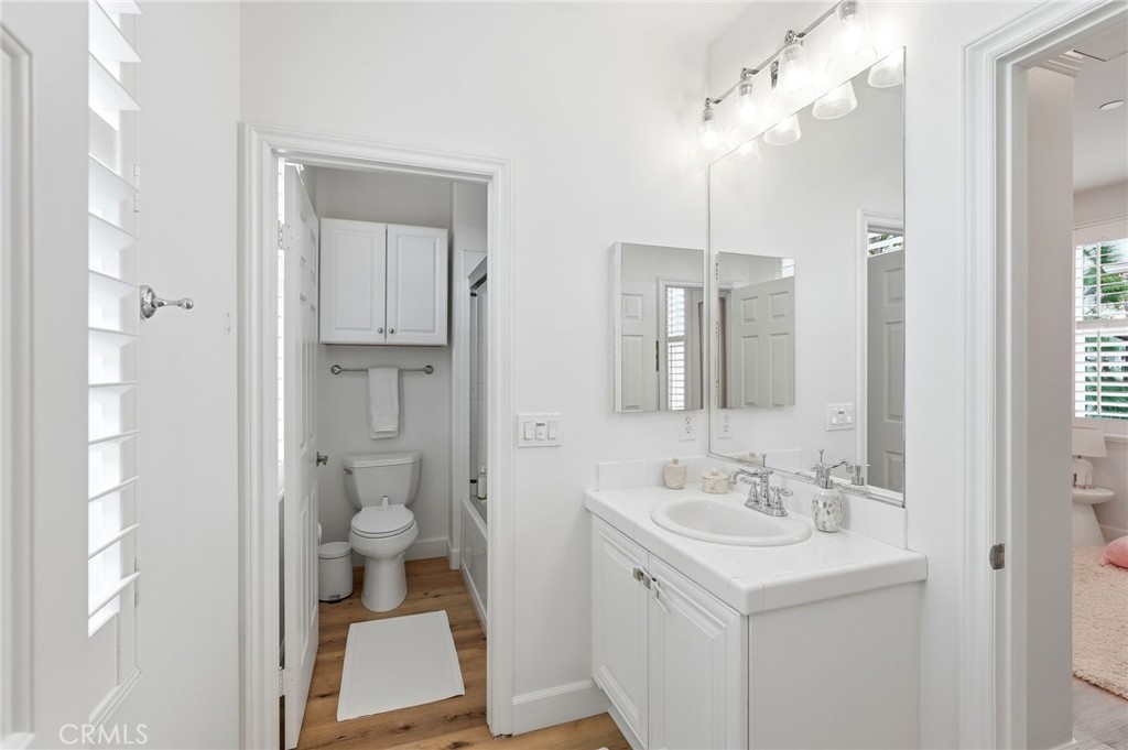 Upstairs you’ll find three bedrooms, a conveniently located laundry room, and a spacious primary suite with a beautiful custom closet. Additional highlights include luxury vinyl plank flooring, plantation shutters throughout, a private patio, and a two-car garage.