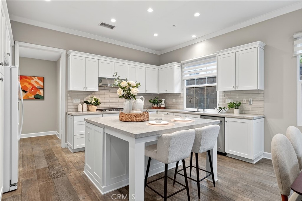 Beautiful home in Eastwood Village. This residence features a modern kitchen with sleek white cabinetry, a large center island, white Caesarstone countertops, and stainless steel appliances, including a refrigerator. The open-concept layout offers a spacious living room and a separate dining area. All new cabinet in full house.The home includes 4 bedrooms, highlighted by a generous primary suite with soaring ceilings and a large walk-in closet. The downstairs bedroom is comfortably sized. A full laundry room with a sink, washer, and dryer is also included. Convenient nearby parking! A community park, two pools, multiple BBQ areas, a basketball court, and tennis courts are just one block away. Zoned for top-rated Irvine schools and within walking distance of Eastwood Elementary. Close to grocery stores, shopping, restaurants, and bars.