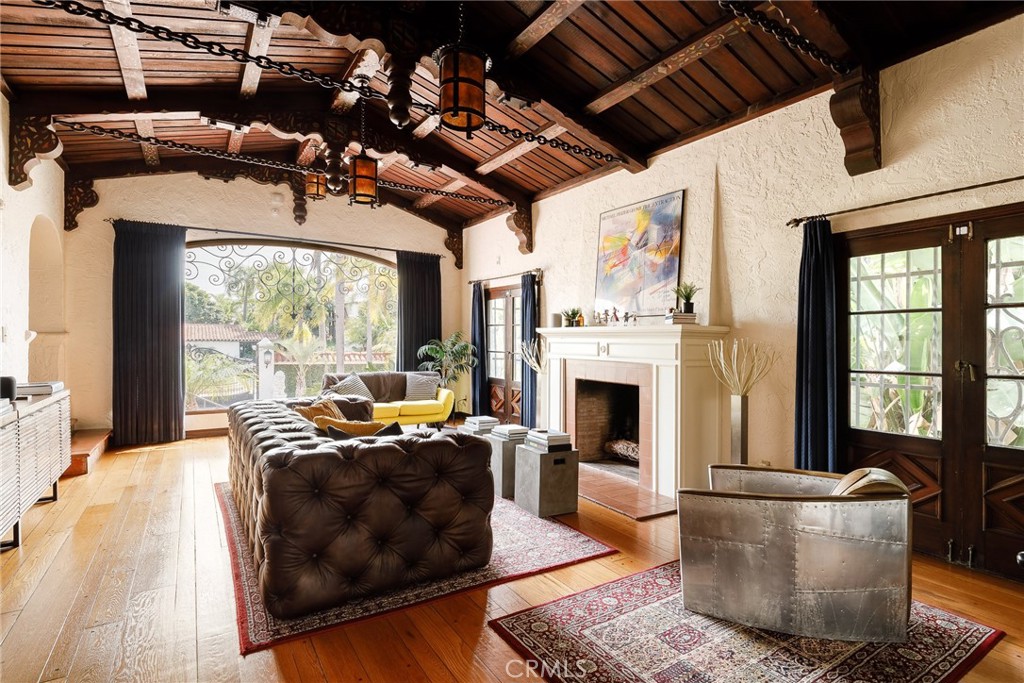 Nestled on a private, gated street in Bluff Park, you will find Vista Del Mar, Harry Broner’s 1930 masterpiece. Vista Del Mar exudes sophistication and understated elegance with fine details such as a grand cathedral ceiling boasting hand-carved wood beams with hand painted embellishments and San Pedro anchor chains, Talavera tiles, wrought iron railings and exterior window details, hand crafted raised panel doors, tray ceilings, textured interior stucco, Moorish arches, and the list continues. A grand entry with circular staircase, wrought iron railings, Spanish red clay tile steps and risers with painted tiles greets you upon arrival. Off to the left is the magnificent living room with a large, arched picture window, stately fireplace, and incredible cathedral style wood beam and iron ceiling. Slightly past the living room is the study with individual wooden beams decorated with hand-painted details. To the right of the foyer is the formal dining room with a crystal chandelier and custom sconces, tray ceiling, double french doors leading to the front balcony, that all lend themselves to the perfect dinner party. Off the dining room is a breakfast nook that is filled with light from multiple windows and a crystal chandelier. The updated kitchen blends original charm with modern Viking appliances. Beyond the kitchen and through the butler’s pantry is the first of two main level bedrooms with french doors leading to the secluded backyard. Down the main hall you will find the elevator room which services all levels. The second main level bedroom is found at the end of the hall. The main floor bathroom features basalt mosaic flooring and pale yellow and gloss black wall tile. Follow the grand staircase to the spacious landing on the second level. Two spacious primary suites can be found on this level with one celebrating ocean views, each with direct access to the two period bathrooms featuring separate shower and bath stalls, built-in vanity, decorated in original Catalina tiles and black accents. This level also contains two more bedrooms with balcony access. A lounge with hand-scraped wood beam ceiling, and ocean views through a wall of windows is located adjacent to the bedrooms. A combination of original hardwood flooring and tile are found throughout the estate’s living spaces. On the ground level is a three car garage, laundry room, wine cellar, and elevator landing. This elegant villa is one lot from the beach.