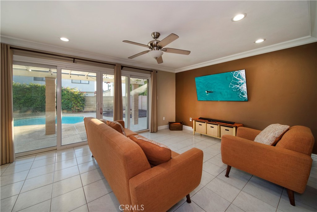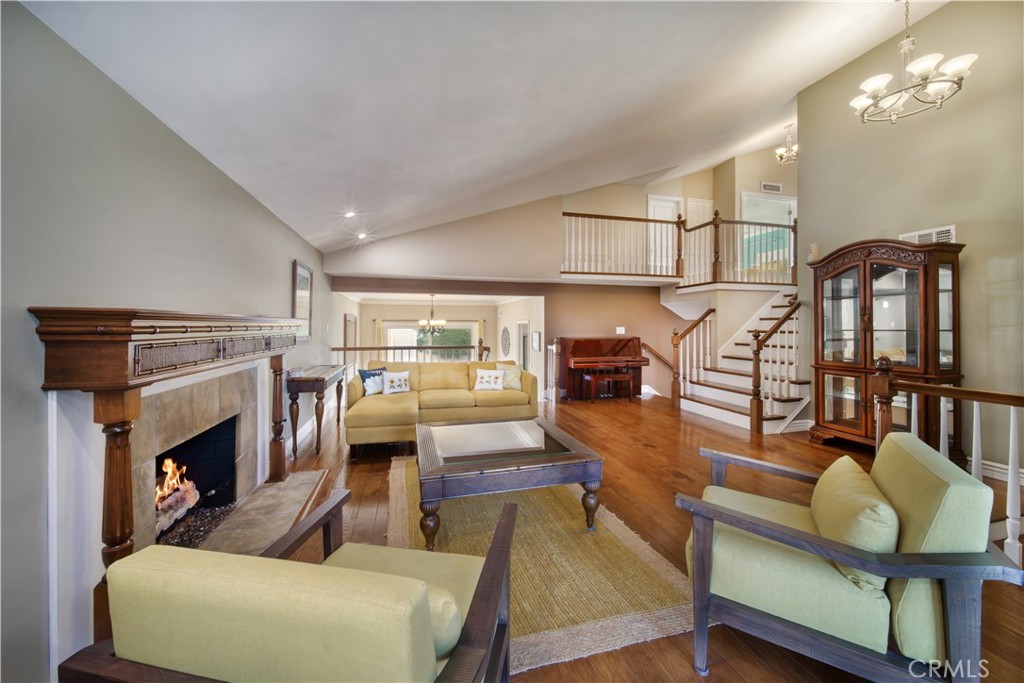 SOUTH HUNTINGTON BEACH - With generous proportions, four spacious bedrooms and large, beautifully maintained grounds, this stylishly upgraded home offers room to grow in the heart of Huntington Beach. Located near the end of a quiet cul-de-sac street, the open split-level design extends approximately 2,780 square feet and showcases a double-door entrance, vaulted ceilings, large windows and a dramatic multi-tiered staircase. Impressive entertaining is easy in a living room with custom fireplace and a formal dining room with crown molding and direct access to the backyard. Sliding-glass doors open the family room to the backyard as well, and the adjacent kitchen is embellished with granite countertops, stainless steel appliances, white cabinetry and a peninsula-style breakfast bar. As an added bonus, this inviting residence offers an extra-rare, fully finished basement complete with a fireplace. Two- and one-half baths are updated with today’s popular finishes and fixtures, and the primary suite hosts a vaulted and beamed ceiling, handsome accent wall, French doors opening to an expansive balcony, a walk-in closet with custom built-ins, and an en suite bath with tiled shower and two sinks. Custom recessed lighting illuminates living spaces that are enhanced with wood and tile flooring, crown molding, a soothing color palette, ceiling fans and elegant lighting fixtures. Grounds span approximately 5,459 square feet and include a private backyard with pool. Perry Elementary School is just steps from home, and shopping centers, beautiful city parks, miles of sandy beaches, Huntington Beach’s famous pier, and the vibrant Pacific City are just minutes away.