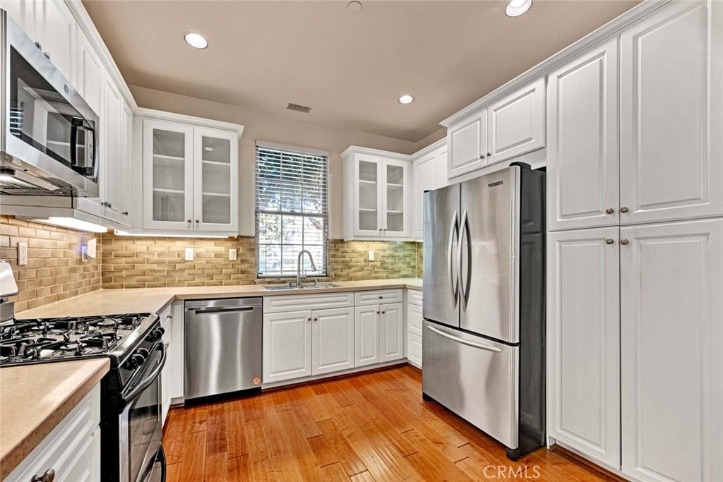 PRIME INTERIOR QUIET LOCATION WITH PRIVATE NICE SIZE SIDE PATIO W/TREES, PLANTS, SHRUBBERY-SHOWROOM CONDITION..Front Door Steps To Ample Street Parking Available..Beautiful Hardwood Floor Entry, LUXURIOUS MAIN FLOOR BEDROOM SUITE W/ Separate Shower, Deep Oval Soaking Tub, Dual Vanities..Spacious Open Kitchen W/Upgraded Counter Tops, Full Backsplash, White Euro-Cabinets, Glass Display, Stainless Steel Appliance Package, Four Burner Cooktop, Pantry, REFRIGERATOR, Individual laundry room with WASHER/DRYER Extends To Oversized Family Room w/Fireplace, Built-in Buffet, Spacious Upper Level Secondary Bedrooms-Abundance Of Wardrobe Closet Space, Convenient Direct Access Two Car Garage, Resort Lifestyle Association Amenities: Pools, Parks, Spas, Clubhouse, Sports Courts, Walking Trails...Walk To Shopping, Schools, World Class Restaurants, Close to Freeways, Toll-Roads, Spectrum, John Wayne Airport